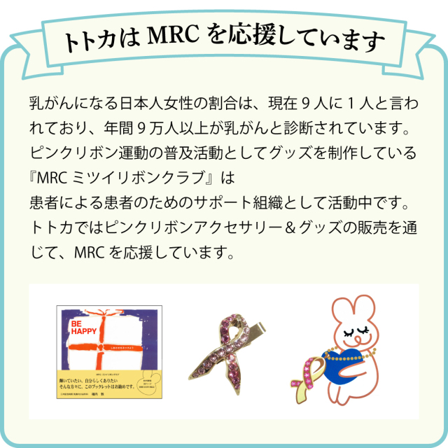 乳がんの「早期発見・早期診断・早期治療」の大切さを伝えるピンクリボン運動を支援する、上品で華やかなピンクリボンアクセサリーです。 【クリップ式】だから穴が開かない! 従来のピンバッジと違い、安全ピンや留め具でジャケットやブラウスの生地に穴を開ける心配がありません。クリップで簡単に挟めるため、洋服の襟元はもちろん、マフラー、帽子、バッグ、ストールなど、場所を選ばずその日の気分で手軽に付けていただけます。 キラキラと輝くスワロフスキー キラキラ輝くローズ&ライトローズのスワロフスキークリスタルを贅沢に使用。動くたびに繊細な輝きを放ち、胸元を美しく彩ります。「見ているだけで元気になれる」とのお声もいただく、気分が上がるデザインです。 ミツイリボンクラブ(MRC)完全オリジナル 山本千佳子さんデザインによる、MRC(ミツイリボンクラブ)だけのオリジナル商品です。乳がん経験者を含む患者によるサポート組織の想いが詰まった、他にはない特別なピンクリボンバッジです。 ■選べるカラーバリエーション ・ゴールド色:定番で華やかな印象 ・ピンクゴールド色:肌なじみが良く人気の優しい色合い ・シルバー色:クールで上品、落ち着いた印象 ■ピンクリボン運動への貢献 この商品は、医療従事者の協力を得ながら「患者による患者のためのサポート」活動を行うMRC(ミツイリボンクラブ)の活動資金としても役立てられます。このピンクリボンアクセサリーを身につけることで、あなたも乳がん支援のメッセージを広げる活動に参加してみませんか。 ご自身用としてはもちろん、大切な方へのプレゼントとしても大変喜ばれています。