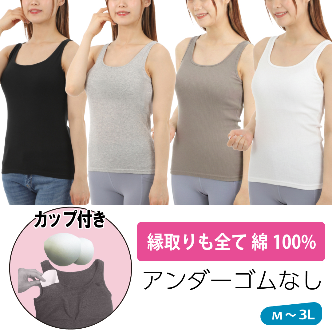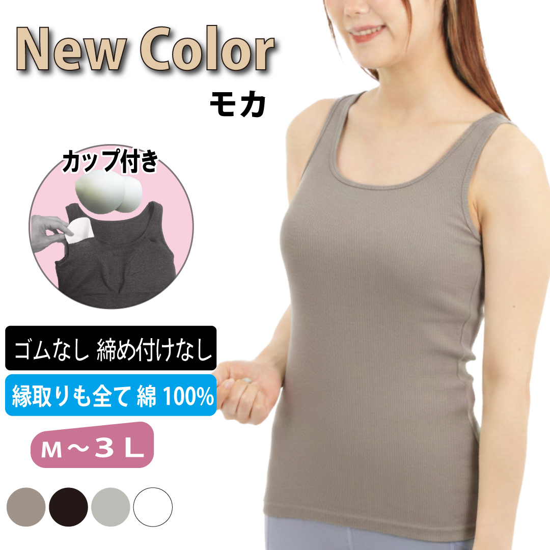 縁取りも全て 綿100 アンダーゴムなし 締め付けない カップ付きタンクトップ専門店おすすめのタンクトップです。リラックスしたい時は勿論、入院、乳がん手術後にも締め付けないので安心です。また、縁取りまで全てコットン100%なので、敏感肌の方にもおすすめです。カップの取外しや交換ができるのでマタニティーやジュニア用としても。グレー、モカ、シロ、黒からお選びいただけます。